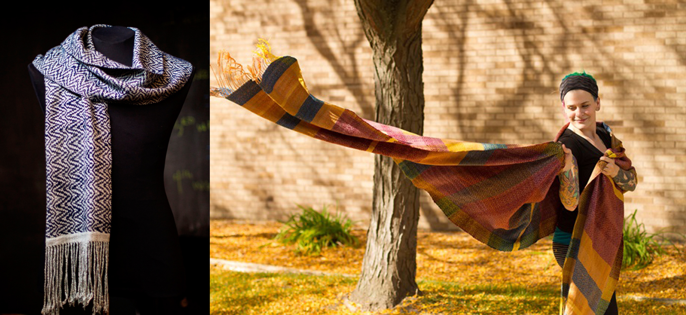 | Snowfall scarf in ice and Indigo colorway by Levon Kafafian (left) by and custom baby wrap by for doula and mother Laurel Miller by Levon Kafafian (right). |