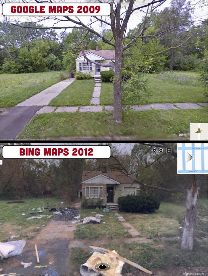 | screenshots via Google and Bing of an occupied home (top) in 2009 and the same home abandoned (bottom) in 2011 |