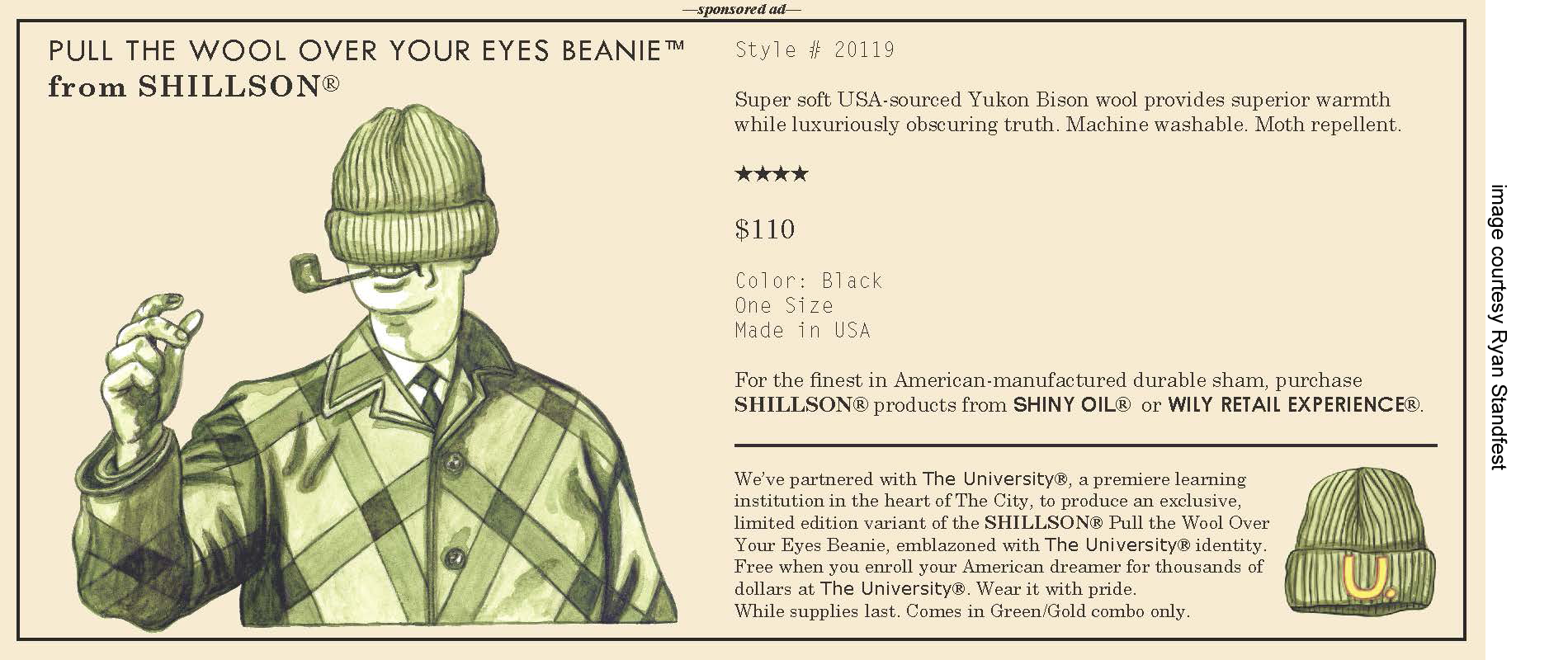 And what products SHINY OIL made! As their advertising made note: Everything is built with only the best available parts, utilizing a special assembly process in their top-of-the-line city factory, whereby actual human workers toil to put crap together by hand, one tedious piece at a time, for the buyer to fully enjoy luxury at its finest. This comes from the epiphany that to truly appreciate the finer things in life, those things must come with the knowledge that quality is achieved by those earning less money than you, but who are actual Americans, working right here, in the city you occasionally visit for sporting events, small plate dining experiences or hookers. There were the $2,000 hand-assembled, artisanal lunchboxes, each one in a numbered edition, made from only the finest durable imported materials; the high-quality, finely-crafted $3,000 scooters that would make America quiver and piss itself silly with blue-collar pride once again; the designer line of genuine leather and silver dog refuse collection units advertised as the first of their kind to be manufactured on American soil, developed by scorching hot gallery artist and fashion photographer Jean-Michel Rouche, with an army of eager beaver art students recruited from The University with the promise of “advancement in life”; and “a miscellany of conscientiously appointed handicrafts straight from factory-town USA,” that would “appeal to those who were both adrenalized by hardcore quality in their products and emotionally attached to the hardworking folk who assembled those products.” And then there were the $50,000 American flags. Not just any American flags, mind you, but those hand-sewn by actual maimed veterans of foreign wars against tyranny in the Middle East, made only with the finest, high quality thread to remind you that the republic is a place of luxury. You could throw one of these patriotic symbols down on a king or queen bed and have a hot copulation session with the most high-priced escort you could find downtown. It’s about freedom of lifestyle. It’s about the right to choose luxury. It’s also about good old American know-how and labor.