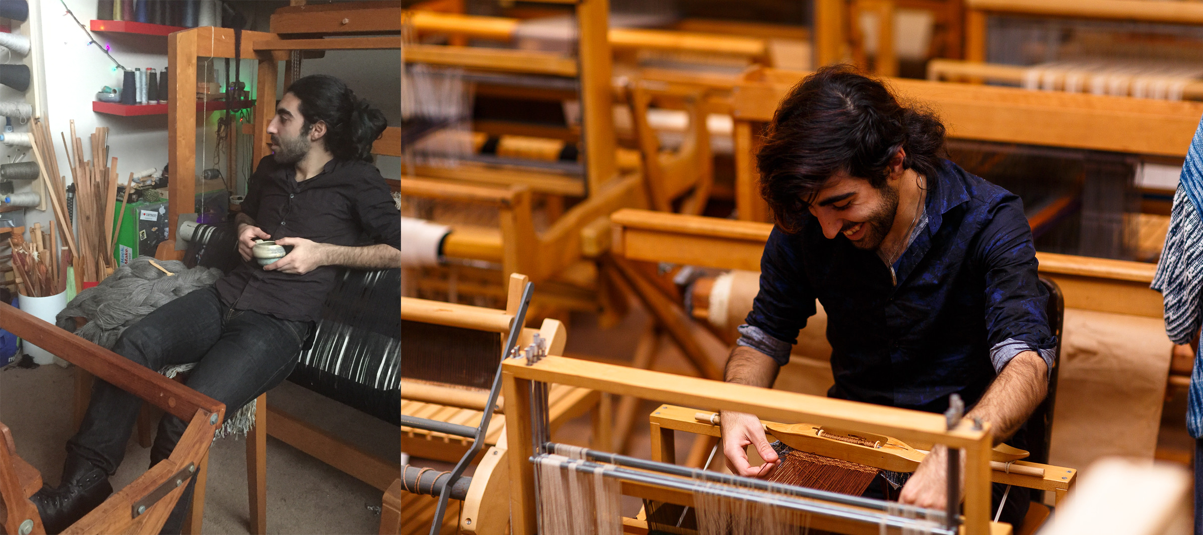 This is my second visit to the Fringe Society, Levon Kafafian’s weaving studio and school. He greets me warmly and leads me through the main room filled with looms and spools of yarn into his kitchen, where I am served tea from pale green, handmade pottery. The first time I was his guest, we drank strong Armenian coffee and Levon told me that he could read my future in the black grounds remaining at the bottom of my miniature metallic cup.