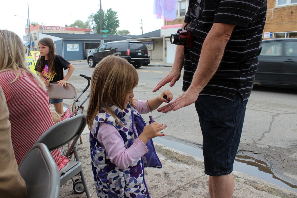 The fastest oil-change contest (fig. 2)! A nail polish booth! These and other whimsical, imaginative Porous Borders events drew folks from the neighborhood in a way that revealed just how accessible art can be – without patronization, dumbing down, nor smug, tongue in cheekiness, but with genuine appreciation for the joy of artful engagement at many levels. The nail polish booth engaged excited kids – and some adults - in fingernail art, and they lined up to express their creativity (fig. 3).