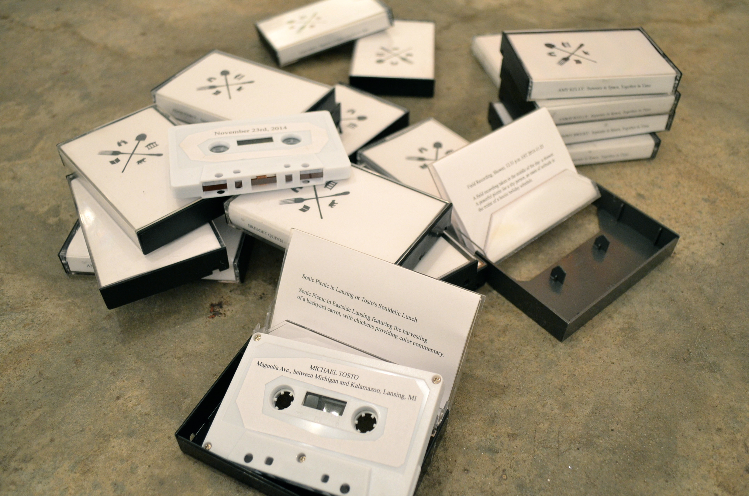 sometimes a picnic is just a picnic sometimes a picnic is not a picnic sometimes a picnic is not just a picnic because sometimes a picnic is not a picnic when the idea of picnicking is so that the place doesn't matter just a blanket and food in space sometimes a picnic is not just a picnic at all picnicking has that sneaky k picnicking is a state static we just can't get there from here sometimes is a synonym for picnic like legs on a potato symbolizing is also a word for picnic eating outside is just not that much fun like party clothes are always itchy it's my fantasy picnic where you bring cloth napkins and there are no plastic cups the basket is heavy always forgetting something important thinking the object will complete the dream and so on we forget transcendence for salt and pepper on a moonlit night see how easy it is hauling our things and calling it home I want to include you because I picnic alone to the sound of beach waves or wind through beeches breaching beseeching licking my fingers no matter how much I try to share the characters get mixed up in my head and I find it difficult to think to sort apples are picnics crisp linen sharp and the sound it's like cracking but in a good way as if a crack could be a good thing a breach a brake a pause applause sounds like apple eating too clapping is something you do together I have a picture of us all eating apples together we are standing and sheepish laughing at our audacity to share the sounds of eating cracking us up holding our sides sticky juicy fingers glad it's not soup the path is a little bit open today and I am rushing around procrastinating unwinding my gut I am glad the door was open for a little bit all my writing seeks the same rhythm the 4/4 as I struggle for 6/8 it's just breathing I'm not gonna make it tonight the frenzy will wear off this is my fort my prison protector smelling scratchy damp wool remember? it is always just me Eastside Lansing featuring the harvesting of a backyard carrot, with chickens providing color commentary. These sounds were captured on a short walk from our house on Vinewood Street in Southwest Detroit to empty the compost bucket at the Hubbard Farms Community Garden; then back home and inside of our house where we were followed upstairs and into our room by our cat. I was happy to hear the rain holding me inside. Michael and I wandered around the house looking for sounds that caught our fancy with his tape recorder. As he transferred the sounds to a digital file I played my old Ukulele. I also sent you a recording from a walk I took with Banjo. Beautiful sunny Sunday morning in rural Rhode Island, taking advantage of the last nice days of fall to work out in the old orchard composting and mulching apple trees before winter. Fields are filled with birds dart to and fro, gliding on the breeze a turkey vulture. Digging, raking, shoveling in compost and mulch, moving tools & wheelbarrow to the next tree. Blue Jay being territorial. Distant sound of mower... Alone in my temporary, century-old, uninsulated attic, hearing rain outside, feeling wind breeze through cracks in surrounding wooden walls, and watching plastic crinkle on the floor, as I dreamily contemplate the work of Hans Rosenström. Inspired by the Picnic Club and such seminal field recordings as Sounds of a Tropical Rainforest in America, Sounds of North American Tree Frogs, Sounds of the Junkyard, the Environments series, The Voice of the Turtle, and the Golding Institute's Sounds of the American Fast Food Restaurants, I recorded some whistling plants. I also captured some of the ambient sounds of the search, and a bit of appropriate theory and conjecture that I happened to discover on television later in the evening. These particular plants were found not too far from where Vinewood dead-ends into the north side of I-96. Me and Baby Bunny as Interrupted by My Neighbor Rachel and homecoming after a long and cold walk through my neighborhood. I made this recording while working in the studio yesterday, putting a construction together while studio mates (The HE/BOPS) worked on their latest album. The construction used copper wire, drywall, 2x4s and a ladder, as well as a flight of stairs. 17:24, Tape Recorder. A walk on Moran Street with Emily Piellusch, 7PM